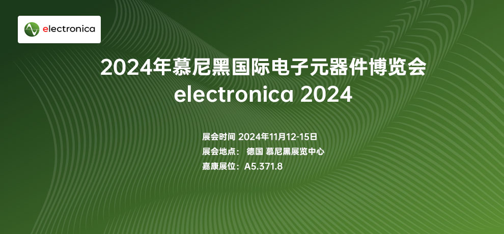 德國慕尼黑國際電子元器件展展覽會,是歐洲及世界上規模最大和影響最廣的電子元器件專業博覽會,從組件到系統,從應用到服務,electronica展品范圍覆蓋了整個電子產業的技術、產品和處理過程。展會緊緊把握智能網聯汽車、物聯網、工業自動化、5G通訊等熱門應用市場,嘉康電子積極參展,熱忱歡迎來自全球的合作伙伴和行業精英。